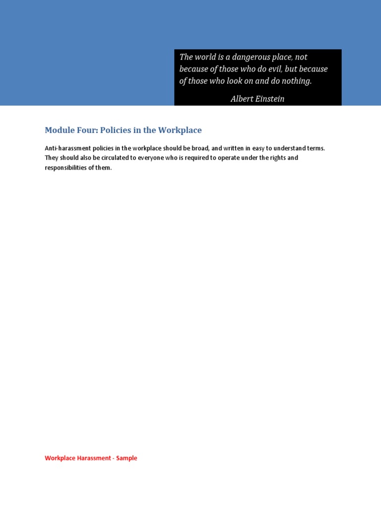 When one thinks of an anti-harassment policy in the workplace, the first thing that comes to mind may be what the company is required to do in order to protect its employees from harassment, but the fact is, an anti-harassment policy is only effective when the employer and its employees play an active role in upholding it. The rights and responsibilities for employees include: Having a clear understanding of the policy itself and making sure there is full knowledge of employees rights and responsibilities within the policy. Attending all trainings outlined in the policy. Avoid conducting any behavior that is prohibited by the policy. Informing the proper authority of any hostile conduct seen committed upon others. Informing the proper authority of any hostile conduct committed toward you. Fully cooperating in the event of an inquiry or investigation