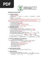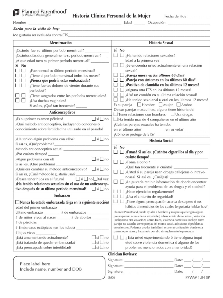 Nombre ___________________________________________________ Edad ______ Ocupacin _______________________ Razn para la visita de hoy: __________________________________________________________________________________ Me gustara ser evaluada contra ETS______________________________________________________________________________ Menstruacin Cundo fue su ltimo perodo menstrual? _____________ Cuntos das dura generalmente su perodo menstrual? ____ A que edad tuvo su primer perodo menstrual? __________ S No n n Fue normal su ltimo perodo menstrual? n n Tiene el perodo menstrual todos los meses? n n Piensa que podra estar embarazada? n n Tiene fuertes dolores de vientre durante sus perodos?? n n Tiene sangrados entre los perodos menstruales? n n Usa duchas vaginales? Si as es, Qu tan frecuente? ______ Anticonceptivos Es su primer examen plvico? n s n no Qu mtodo anticonceptivo, incluyendo condones conocimiento sobre fertilidad ha utilizado en el pasado? ___________________________________________________ Ha tenido algn problema con ellos? n s n no Si as es, Qu problema? ______________________________ Mtodo anticonceptivo actual _________________________ Por cunto tiempo? ______ Algn problema con l? n s n no Si as es, Qu problema? _____________________________ Quisiera cambiar su mtodo anticonceptivo? n s n no Si as es, Cul mtodo le gustara usar? __________________ Desea tener hijos en el futuro? n s n no n tal vez Ha tenido relaciones sexuales sin el uso de un anticonceptivo despus de su ltimo perodo menstrual? n s n no Embarazo S No Historia Sexual