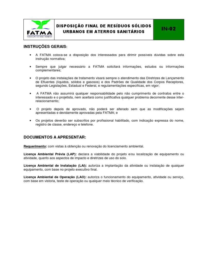 A FATMA coloca-se a disposio dos interessados para dirimir possveis dvidas sobre esta instruo normativa; Sempre que julgar necessrio a FATMA solicitar informaes, estudos ou informaes complementares; O projeto das instalaes de tratamento visar sempre o atendimento das Diretrizes de Lanamento de Efluentes (lquidos, slidos e gasosos) e dos Padres de Qualidade dos Corpos Receptores, segundo Legislaes, Estadual e Federal, e regulamentaes especficas, em vigor; A FATMA no assumir qualquer responsabilidade pelo no cumprimento de contratos entre o interessado e o projetista, nem aceitar como justificativa qualquer problema decorrente desse interrelacionamento; O projeto depois de aprovado, no poder ser alterado sem que as modificaes sejam apresentadas e devidamente aprovadas pela FATMA; e Os projetos devero ser subscritos por profissional habilitado, com indicao expressa do nome, registro de classe, endereo e telefone.
