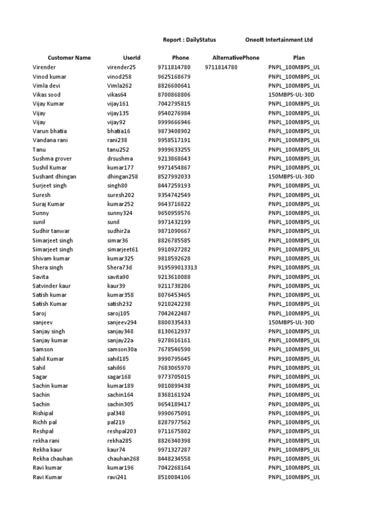 Customer Name UserId Phone AlternativePhone Plan