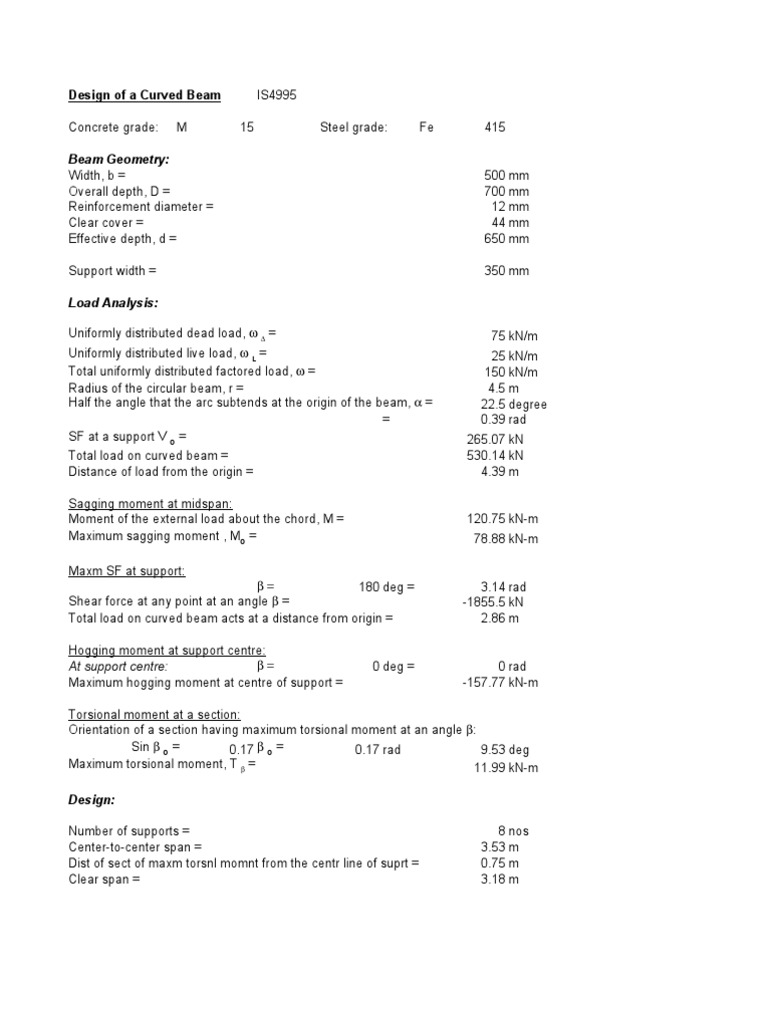 Beam Geometry: Width, b = Overall depth, D = Reinforcement diameter = Clear cover = Effective depth, d = Support width = Load Analysis: Uniformly distributed dead load, = Uniformly distributed live load, L = Total uniformly distributed factored load, = Radius of the circular beam, r = Half the angle that the arc subtends at the origin of the beam, = = SF at a support V O = Total load on curved beam = Distance of load from the origin = Sagging moment at midspan: Moment of the external load about the chord, M = Maximum sagging moment , MO = Maxm SF at support: