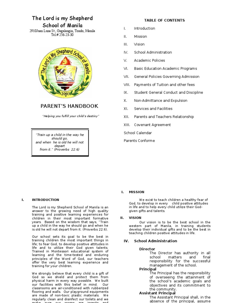 I. I. INTRODUCTION The Lord is my Shepherd School of Manila is an answer to the growing need of high quality training and positive learning experiences for children in their most important formative years. Based on the wisdom that says, Train up a child in the way he should go and when he is old he will not depart from it. (Proverbs 22:6). Our school sets its goal to be the best in training children the most important things in life; to fear God, to develop positive attitudes in life and to utilize their God given talents. Trained in Montessori educational system of learning and the time-tested and enduring principles of the Word of God, our teachers offer the very best learning experience and training for your children. We strongly believe that every child is a gift of God so we shield and protect them from physical harm in every way possible. We built our facilities with this belief in mind. Our classrooms are air-conditioned with rubberized flooring and walls. Our playground equipments are made of non-toxic plastic materials. We regularly clean and disinfect our toilets and we make sure our rooms are insects and mosquitoes free. Your children will be the safest, most comfortable and healthy surrounding possible. And with the spacious school ground far from main thoroughfares and a guard taking oversight of the two gates, you need not worry about your childs safety. Truly, at the Lord is my Shepherd School of Manila, Your children are safe in our hands.