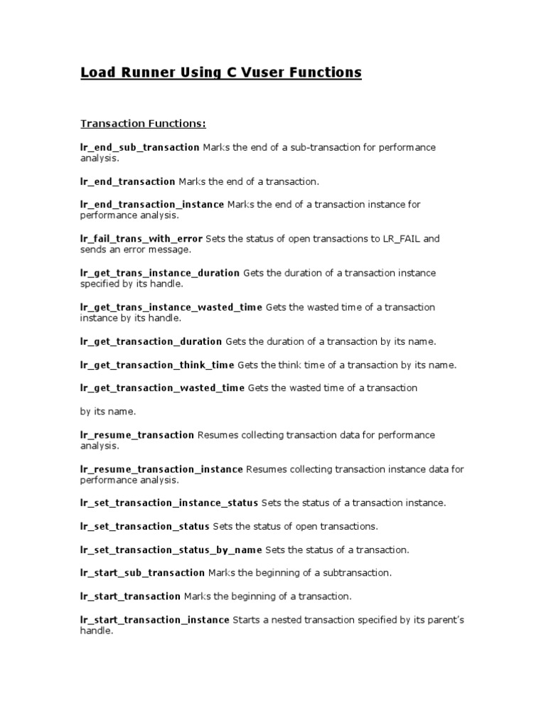 lr_end_sub_transaction Marks the end of a sub-transaction for performance analysis. lr_end_transaction Marks the end of a transaction. lr_end_transaction_instance Marks the end of a transaction instance for performance analysis. lr_fail_trans_with_error Sets the status of open transactions to LR_FAIL and sends an error message. lr_get_trans_instance_duration Gets the duration of a transaction instance specified by its handle. lr_get_trans_instance_wasted_time Gets the wasted time of a transaction instance by its handle. lr_get_transaction_duration Gets the duration of a transaction by its name. lr_get_transaction_think_time Gets the think time of a transaction by its name. lr_get_transaction_wasted_time Gets the wasted time of a transaction by its name. lr_resume_transaction Resumes collecting transaction data for performance analysis. lr_resume_transaction_instance Resumes collecting transaction instance data for performance analysis. lr_set_transaction_instance_status Sets the status of a transaction instance. lr_set_transaction_status Sets the status of open transactions. lr_set_transaction_status_by_name Sets the status of a transaction. lr_start_sub_transaction Marks the beginning of a subtransaction. lr_start_transaction Marks the beginning of a transaction. lr_start_transaction_instance Starts a nested transaction specified by its parents handle.