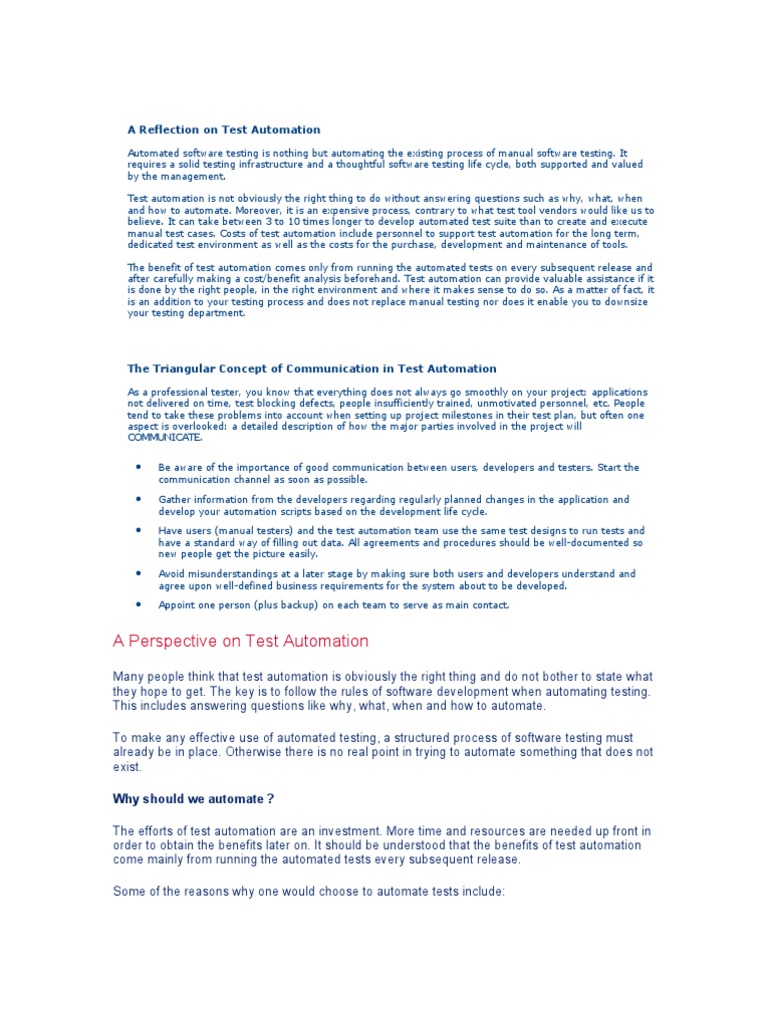 verify that users and developers have a common understanding regarding the requirements and to make sure the application becomes what it should be. This is not always an easy job. I think most of you will admit to have encountered some of these situations. So what should you do about it? Being aware of the importance of a good communication between these groups is already a big step forward. Make sure you start the communication channel as soon as possible in order to avoid problems. Once certain processes have been set up (i.e. no proper communication channels), it can be a tough job to change them. Make sure you have regular meetings with developers (depending on the release schedule) regarding application alterations. Ensure to receive all necessary information regarding the regularly planned changes in the application. The idea here is to develop your automation scripts based on the development life cycle. If there is no real planning of the development life cycle, then it becomes difficult for an automation team to predict changes, causing an additional script maintenance effort. Make sure that users (manual testers) and test automation team use the same test designs to run tests and that you have a standard way of filling out data. All agreements and procedures should be well documented so that new people can easily get the picture. Ensure regular communication in order to synchronise the needs of both teams. At the start of the project, both users and developers should understand and agree upon welldefined business requirements for the system about to be developed. If business rules are not yet defined, a lot of misunderstandings may arise at a later stage (knowing that developers are working on a very technical level). Make sure to have one person (plus backup) in each team who serves as the main contact point. This approach will make it a lot easier in case of problems. If the person cannot answer your question immediately, he can consult his team in order to provide an answer.