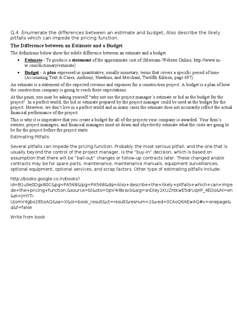 4 Enumerate the differences between an estimate and budget, Also describe the likely pitfalls which can impede the pricing function.