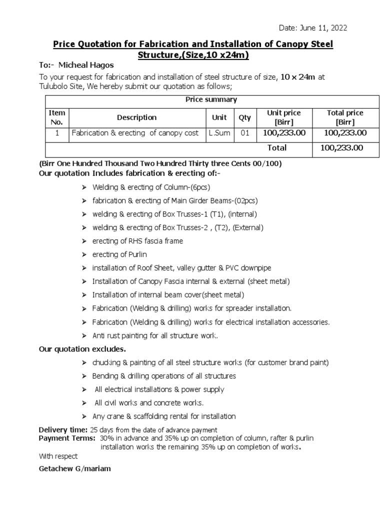 Price Quotation for Fabrication and Installation of Canopy Steel