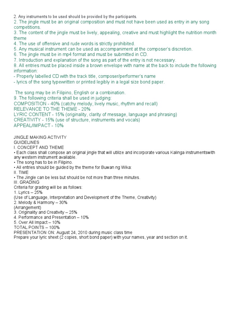 • Each class shall compose an original jingle that will utilize and incorporate various Kalinga instrumentswith