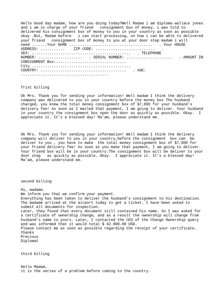 delivery fee! As soon as I mailed that payment, I am going to deliver. Your husband
