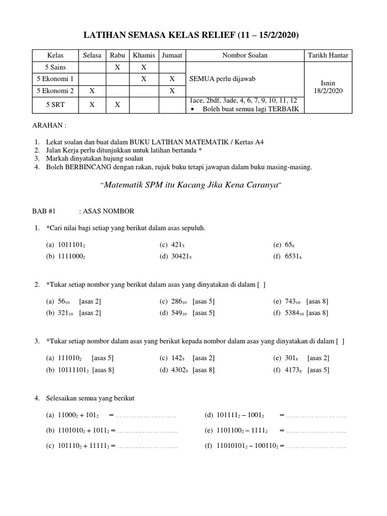 Kelas Selasa Rabu Khamis Jumaat Nombor Soalan Tarikh Hantar