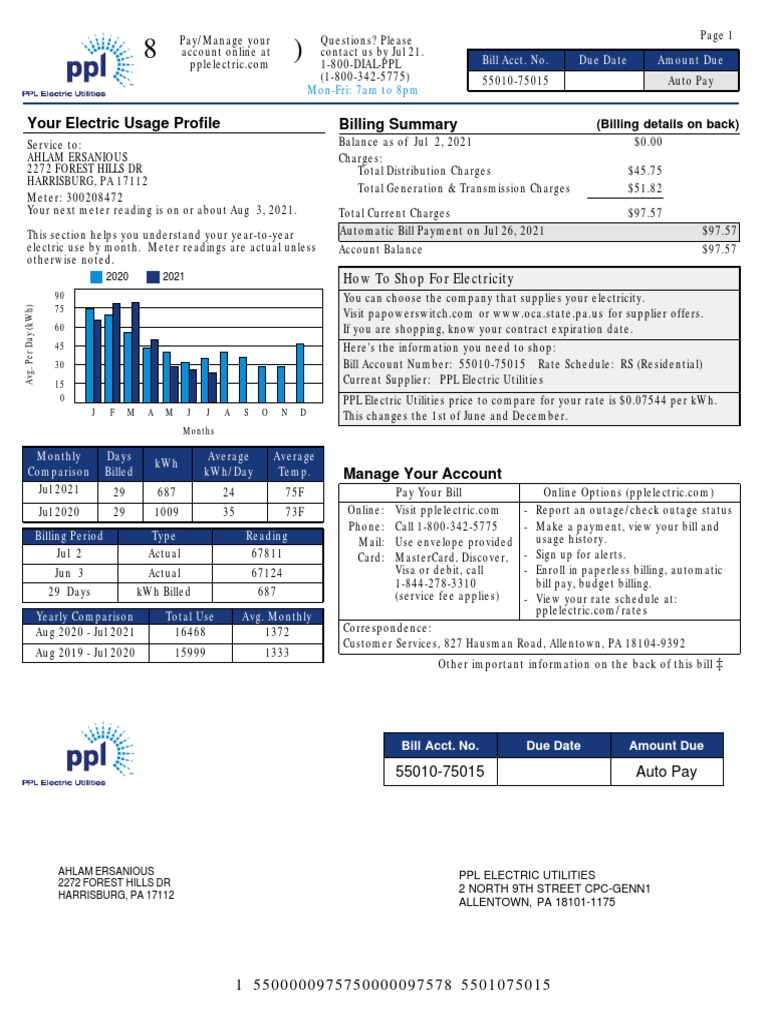 PPL Electric Utilities bills online. The process is free, Payment Received Jun 22, 2021 - Thank You! -$106.26