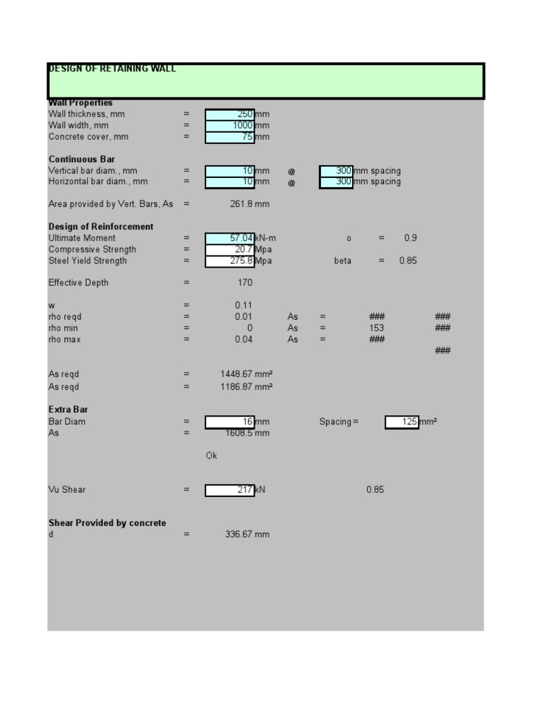 Wall Properties Wall thickness, mm Wall width, mm Concrete cover, mm Continuous Bar Vertical bar diam., mm Horizontal bar diam., mm Area provided by Vert. Bars, As Design of Reinforcement Ultimate Moment Compressive Strength Steel Yield Strength Effective Depth w rho reqd rho min rho max