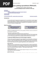 method has been adopted by a number of researchers, particularly those working in glacial environments (e.g. Hart, 1995; Bennett et al., 1997), where it has proved useful in discriminating between sediments actively transported in the zone of traction at the glacier bed and passively transported englacially or supraglacially (Bennett et al., 1997). The diagrams have also found use in a number of other fields (e.g. Bertran et al., 1997; Verrecchia et al., 1997; Higgitt and Allison, 1999). These diagrams have a number of advantages over alternatives (Benn and Ballantyne, 1992, 1993, 1995), most significantly that the ratios vary linearly, resulting in even distribution of particle forms across the diagram without distorting the shape continuum. The diagrams are also easier to understand than alternatives, and the plotted values are easily calculated. It has been demonstrated that the diagram is an effective tool for the identification of useful descriptive indices and analytical methods (Benn and Ballantyne, 1993, 1994). Many geological and graphing software packages are able to produce triangular diagrams. However, the diagram axes are scaled in either a clockwise or anti-clockwise direction, with each axis representing a portion of a whole unit. Such packages can only be used for plotting diagrams where the position of a point represents the relative proportions of three variables that sum to 1 or 100 per cent. The most common sedimentological application of this type of diagram is the plotting of grain size characteristics such as the proportions of sand, silt and clay in a sample. The axes in the Sneed and Folk diagram are arranged differently from the conventional triangular diagram, and the use of ratios results in the variables not summing to 1. Sneed and Folk diagrams cannot, therefore, be plotted with conventional software. Since hand drawn triangular diagrams are laborious to complete, this paper presents an Excel spreadsheet for their rapid preparation. For completeness, the spreadsheet may also be used to generate conventional triangular diagrams. TRI-PLOT TRI-PLOT is available from the Wiley Interscience web site ([Link]). It has been developed using Microsoft Excel 97 and is known to work with Excel 2000. It is not compatible with earlier versions. The spreadsheet consists of five sheets. The first sheet contains instructions and information about TRI-PLOT. The second and third sheets are used to generate Sneed and Folk diagrams. Data are entered and results presented on the second sheet (SHAPE Data & results), and calculations take place behind the scenes on the third sheet (SHAPE Calcs.). The fourth and fifth sheets are used to generate standard triangular diagrams for the representation of particle size. The operation of the spreadsheet is summarized below. Full instructions and details of how to prepare conventional triangular diagrams are contained in the first sheet. The data & results sheet is divided into three parts: the data entry area, the plotting parameters area, and the triangular diagram itself. The spreadsheet is configured to allow the dimensions of up to 50 particles to be