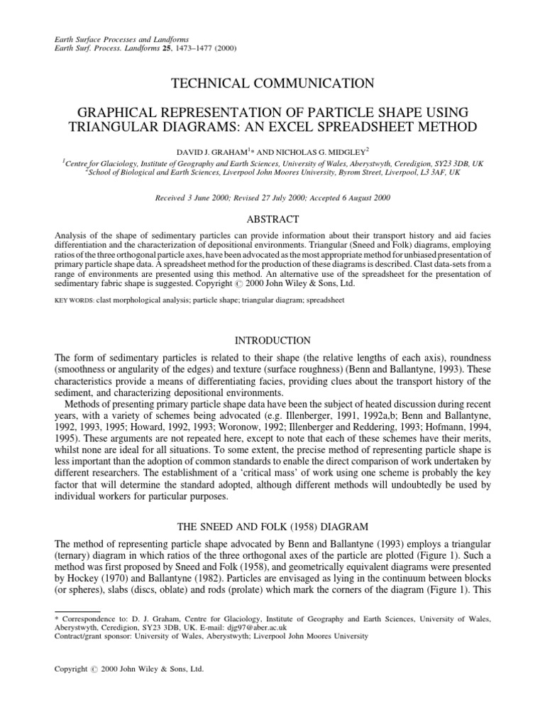 Analysis of the shape of sedimentary particles can provide information about their transport history and aid facies differentiation and the characterization of depositional environments. Triangular (Sneed and Folk) diagrams, employing ratios of the three orthogonal particle axes, have been advocated as the most appropriate method for unbiased presentation of primary particle shape data. A spreadsheet method for the production of these diagrams is described. Clast data-sets from a range of environments are presented using this method. An alternative use of the spreadsheet for the presentation of sedimentary fabric shape is suggested. Copyright # 2000 John Wiley & Sons, Ltd.
