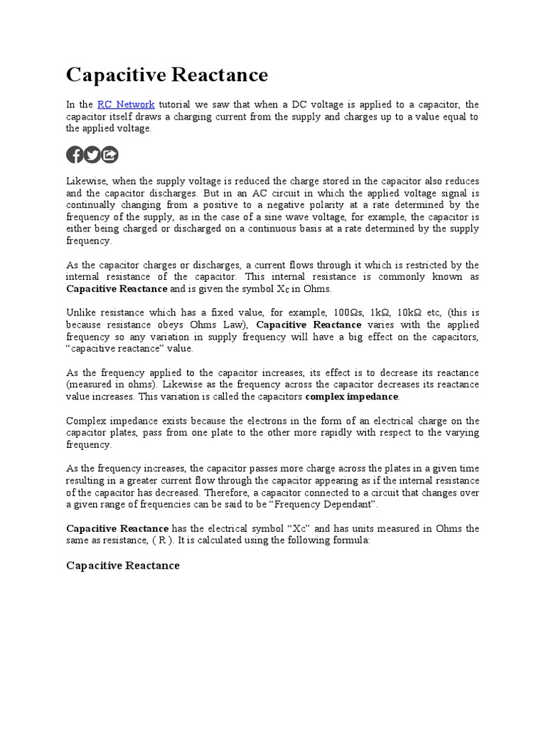 Capacitive Reactance has the electrical symbol “Xc” and has units measured in Ohms the