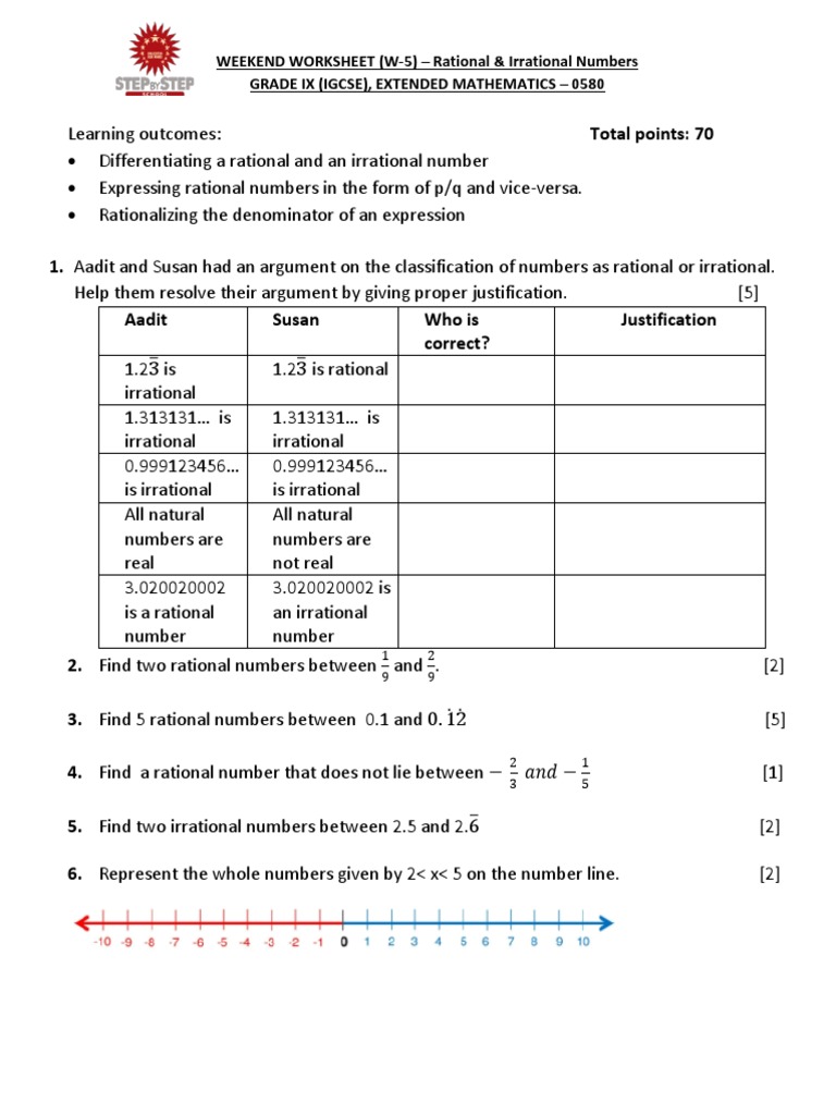 WEEKEND WORKSHEET (W-5) – Rational & Irrational Numbers