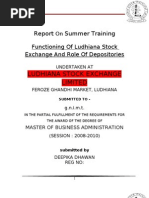 LSE commence trading in demat shares from November 16, 1998 by becoming aparticipant of NSDL. The exchange has set up in-house DP services to facilitatetrading and settlement in demat securities. INVESTOR GRIEVANCES CELL LSE has made special arrangement to handle investors complaints andgrievance so its premises for providing information relating to Capital market.This center has a well equipped library.The exchange introduced a computer based stock. Tel system for providing online real time information through a fully automatic system, to the investors andmembers of the general public such as prices of the scrips, book closures, newlistings, new issuers etc. Centre is also equipped with a screen for providing liverates of trading at NSE and BSE DEPOSITORY PARTICIPANT SERVICE The company is the DP of NSE and is the only depository in the region having online real time connectivity with NSDL. DP operation of the company not only benefited the investors of the region but has also proved to be a s o u r c e o f income for the company PROFILE OF LSE SECURITIES LTD.OBJECTIVE OF THE COMPANY LSE Securities Limited is a subsidiary of the Ludhiana Stock Exchange, whichwas formed with an objective to enhance business and investment opportunitiesfor the investors and members of Ludhiana Stock Exchange at large, throughinnovative products by encompassing a variety of activities related to the capitalm a r k e t . T h e c o m p a n y h a s a p a i d u p c a p i t a l o f R s . 5 . 6 5 c r o r e s , p r e f e r e n c e capital of Rs 7.90 lacs & the authorized capital of the company is Rs 8 crores.