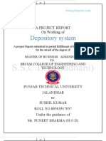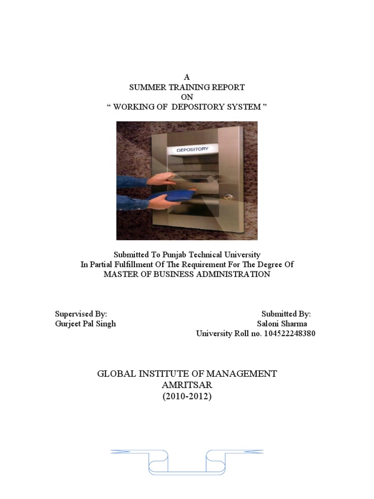 This is to certify that project entitled working of depository system being submitted by saloni sharma, a student of mba III semester of global institute of management, amritsar to Punjab technical university for the award of the degree of master of business administration, is a bonafide piece of work conducted under my direct supervision and guidance. To the best of my knowledge, no part of this work has been submitted for any other degree of any other university. The data sources have been duly acknowledged.