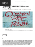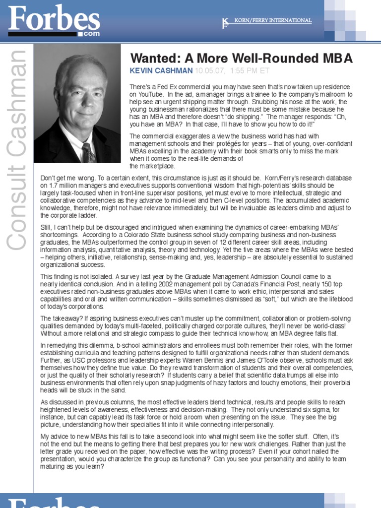 With a large baby boomer void in the workplace looming, MBA-adorned practitioners have a tremendous opportunity to re-shape business practice. Still, certifiable knowledge of the issues alone wont suffice. To outdistance others to the top, young leaders must know themselves and their colleagues, fluently and persuasively working within larger human development issues to achieve better results. Below I address your specific questions related to MBAs and leadership. As usual, specific names have been withheld to preserve a free dialogue. exeCuTive DireCTOr, exeCuTive eDuCATiON CONsOrTium: Some business schools now offer undergraduate business-to-MBA pre-admission programs. Given that, is there a need for curriculum changes in business schools that blend in more liberal arts topics? Are MBAs becoming too onedimensional by following a total business curriculum? CAshmAN: The research mentioned above certainly suggests that todays b-school grads need to better think outside the spreadsheet and become more well-rounded. At the very least, I think business students should have some exposure to basic human psychology and intercultural relations courses, speech and writing classes and also group/team communication before being even remotely workplace-ready. In addition to the coursework, business schools should strongly encourage not just offer extracurricular activities that MBAs can engage in to broaden their perspectives, become more self-aware and strengthen their relational and strategic compasses. FIRST-YEAR MBA STudENT: Can we learn to be leaders? Can leadership be taught? CAshmAN: Leadership is learnable yet its also true that our effectiveness as leaders hinges on many heredityinfluenced personality traits, such as IQ or emotional composition. Nature and nurture both play important roles in our development. Disentangling the potential origins of our unique traits can be helpful and interesting, but its impossible to ever understand them in full detail. Rather than obsessing on the how and where issues of your leadership style, invest more heavily in considering the what, i.e. your strengths, weaknesses and passions. Growing as leaders means growing as people and in the ways we maintain self-awareness and express ourselves. SECoNd-YEAR MBA STudENT: As future business leaders, how do we impact global issues like poverty, disease and the environment? There is a lot of student idealism around these issues, but how do we carry that into the business world and, more importantly, sustain it? CAshmAN: By finding appropriate ways to be yourselves and express your passions for these issues despite how the flow chart hierarchy reads. Almost every CEO lists more leadership on every level atop their wish list, yet their companies so often fail to encourage the expression of values critical to widespread leadership. Maintain humility as you enter the workforce and team with others, but dont compromise or bury the values that give you a sense of purpose. Think of it this way: Unlike your skills, which can change dramatically over time, your values hopefully have more consistency and continuity throughout your career and life. Keep tight hold of the ideals that matter most to you when re-entering the workforce, and then as you develop new capabilities and gain more of a voice, leverage your skills and values both to make a meaningful difference.