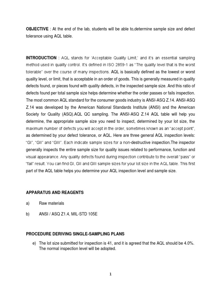 OBJECTIVE : At the end of the lab, students will be able to,determine sample size and defect