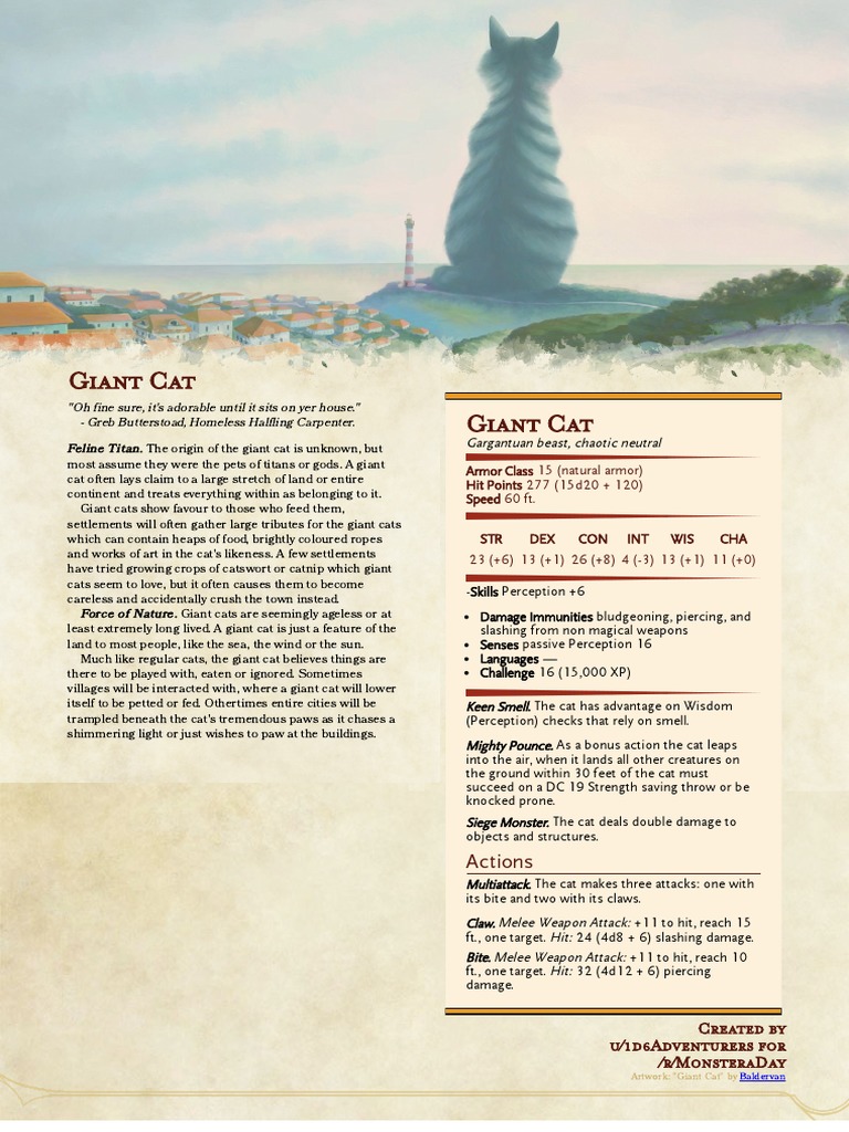 Feline Titan. The origin of the giant cat is unknown, but Gargantuan beast, chaotic neutral