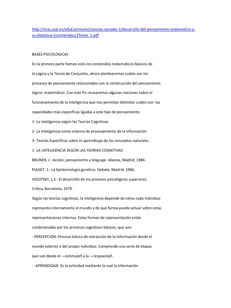 BASES PSICOLOGICAS En la primera parte hemos visto los contenidos matemáticos básicos de la Lógica y la Teoría de Conjuntos, ahora plantearemos cuáles son los procesos de pensamiento relacionados con la construcción del pensamiento lógico- matemático. Con este fin revisaremos algunas nociones sobre el funcionamiento de la inteligencia que nos permitan delimitar cuáles son las capacidades más específicas ligadas a este tipo de pensamiento: 1- La inteligencia según las Teorías Cognitivas 2- La inteligencia como sistema de procesamiento de la información 3- Teorías Especificas sobre el aprendizaje de los conceptos naturales 1- LA LNTELIGENCIA SEGÚN LAS TEORÍAS COGNITIVAS BRUNER, J.: Acción, pensamiento y lenguaje. Alianza, Madrid, 1984. PIAGET, 1.: La Epistemología genética. Debate, Madrid, 1986. VIGOTSKY, L.S.: El desarrollo de los procesos psicológicos superiores. Crítica, Barcelona, 1979. Según las teorías cognitivas, la inteligencia depende de cómo cada individuo representa internamente el mundo y de qué forma puede actuar sobre estas representaciones internas. Estas formas de representación están condicionadas por los procesos cognitivos básicos, que son: - PERCEPCIÓN: Proceso básico de extracción de la información desde el mundo exterior o del propio individuo. Comprende una serie de etapas que van desde el estimulo a la respuesta .