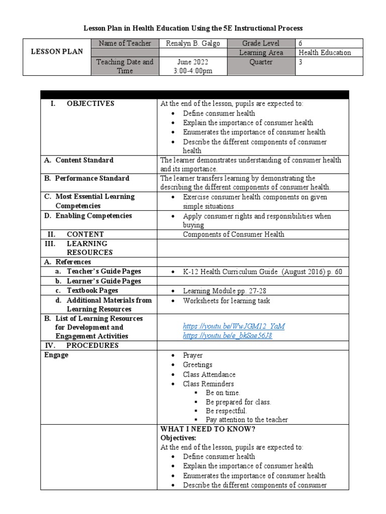 Lesson Plan in Health Education Using the 5E Instructional Process