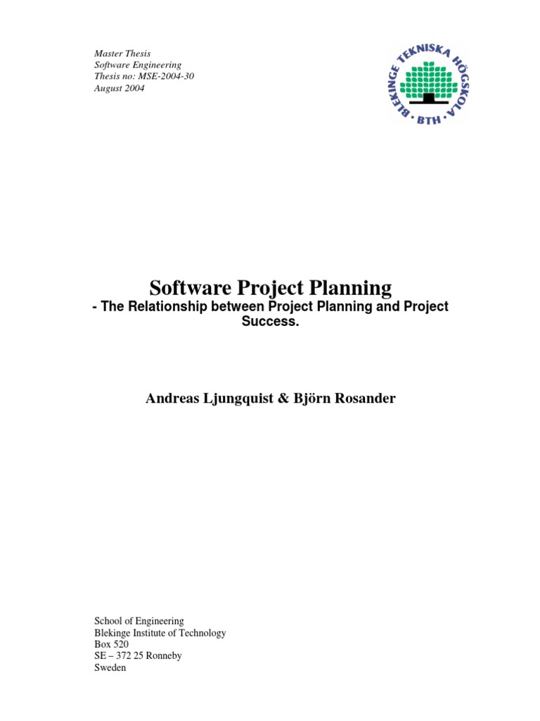 We are two students completing our master of science in software engineering at Blekinge Institute of Technology in Ronneby, Sweden. Software engineering has emerged from the computer science field, but covers also issues such as management, human factors, estimation and control. A major part of project management is concerned with planning efforts. During our university studies weve continually been reminded of how important it is to carefully plan a project in order to achieve success. We have identified and experienced project planning and its underlying activities as difficult and challenging tasks. However, it has