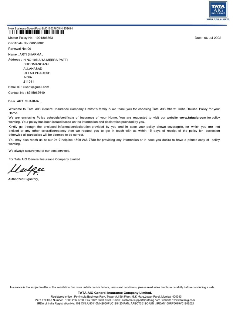 Welcome to Tata AIG General Insurance Company Limited’s family & we thank you for choosing Tata AIG Bharat Griha Raksha Policy for your
