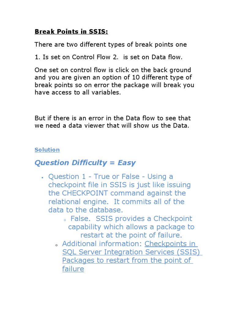 Question 1 - True or False - Using a checkpoint file in SSIS is just like issuing the CHECKPOINT command against the relational engine. It commits all of the data to the database. o False. SSIS provides a Checkpoint capability which allows a package to restart at the point of failure. o Additional information: Checkpoints in SQL Server Integration Services (SSIS) Packages to restart from the point of failure