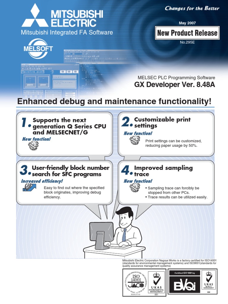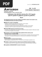 Version Ver. 8 8.48A 8.45X Date marketed May 2007 January 2007 History Supports the latest Q Series CPUs (Q02U/Q03UD/Q04UDH/Q06UDHCPU) Supports MELSECNET/G Block number search for SFC programs available Improved sampling trace Supports redundant local I/O system New print options added in the print settings Supports safety PLC (QS001CPU) Supports up to 8 CC-Link modules Block guarantee of cyclic data per station added in the CC-Link parameter settings Supports SFC block statements The FB definition program capacity expanded to 2048 steps max. Specifying labels for device block replacement available Supports memory size calculation function Improved ladder display Capable of writing X, Y, SM, SD device memory to GX Simulator (supported from GX Simulator version 7.00A) Capable of writing to GX Simulator during RUN (supported from GX Simulator version 7.07H) Capable of copying execution programs to label programs Supports FX3UCPU Desired start device settings available for each station in refresh settings of multiple CPU*1 Supports system monitor's redundant power supply system display*1 Sampling trace data can be stored in standard RAM*1 Supports GOT1000 transparent mode with USB Supports redundant CPU Supports cross reference function Supports ST language debugging function Supports device block replacement Supports CC-Link Ver.2 Supports CC-Link and CC-Link/LT bridge function Supports GOT900 transparent mode Supports basic model QCPU function version B Supports ST language Supports Windows XP Supports basic model QCPU Supports FB function Label programming function added Supports MELSECNET/H remote I/O network Supports multiple CPU function of high performance model QCPU Supports FX1SCPU, FX1NCPU, and A173UHCPU(S1) Supports FX Series SFC Supports MELSAP-L Supports high performance model QCPU Intelligent function module setting utility add-in for GX Developer System monitor function added Graphical connection destination setting screen introduced Supports SFC language Telephone line function added Supports CC-Link diagnostics Supports motion controller program Data conversion software add-on for text and Excel data (CSV format data) Supports FX Series Capable of reading programs created by FX Series programming tool