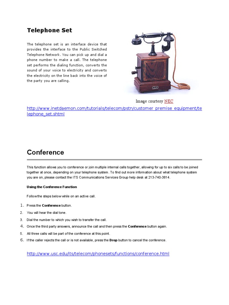 This function allows you to conference or join multiple internal calls together, allowing for up to six calls to be joined together at once, depending on your telephone system. To find out more information about what telephone system you are on, please contact the ITS Communications Services Group help desk at 213-740-3814. Using the Conference Function Follow the steps below while on an active call.