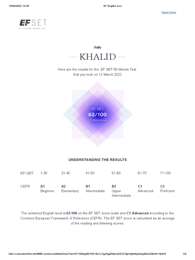 The achieved English level is 62/100 on the EF SET score scale and C1 Advanced according to the