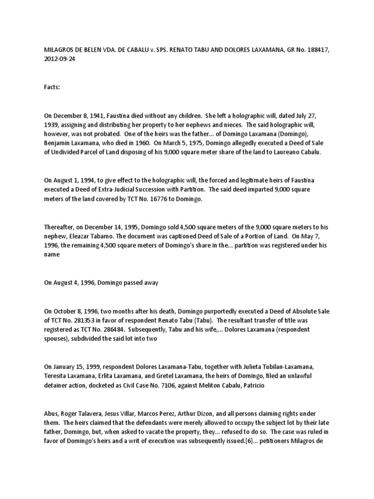 registered as TCT No. 286484. Subsequently, Tabu and his wife,... Dolores Laxamana (respondent