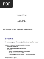 precision is decreased because of Truncations; Calculation of Jacobian matrices is usually very complicated and often leads to significant implemental difficulty; If sample time is not small enough, system may also be unstable. To get a better estimation, Ref.[1] used Unscented Kalman Filter(UKF) method to distill the LOS angular rate. The precision of UKF is better than EKF, it can predict the mean and covariance up to the third order precision. The limitation of UKF is that only Gaussian distributed random variable could be estimated. Compared with EKF and UKF, Particle Filter turns into an efficient method to solve the problems of nonlinearity and nonGaussian dynamic system estimation[2~4]. This method achieves a Recursive Bayesian Filter using Monte Carlo Simulations. The essence of PF is to employ a random sample spaceparticleswith corresponding weights to represent the required probability density function (pdf) [5]. The particles are propagated over time using a combination of sequential importance sampling and resampling steps. The resampling step statistically multiplies and/or discards particles at each time step to adaptively concentrate particles in regions of high posterior probability[6]. These methods are very flexible and can be easily applied to nonlinear and nonGaussian dynamic models. II. PARTICLE FILTER AND ALGORITHM Particle filter algorithm was first brought forward by Gordon in 1993, this is an optimized recursive Bayesian algorithm based on Monte Carlo method. State vectors were expressed as a set of random samples with correlated weights[7~8] in this filtering algorithm, estimation of the states can be worked out based on the weights and samples. The state estimation will be equal to posterior probability density function when number of samples is enough. i i i Assume the weights wk are normalized, { xk , wk }iN=s1 denotes the random particles which represent for pdf, and the pdf at sample step k can be approximately expressed as: