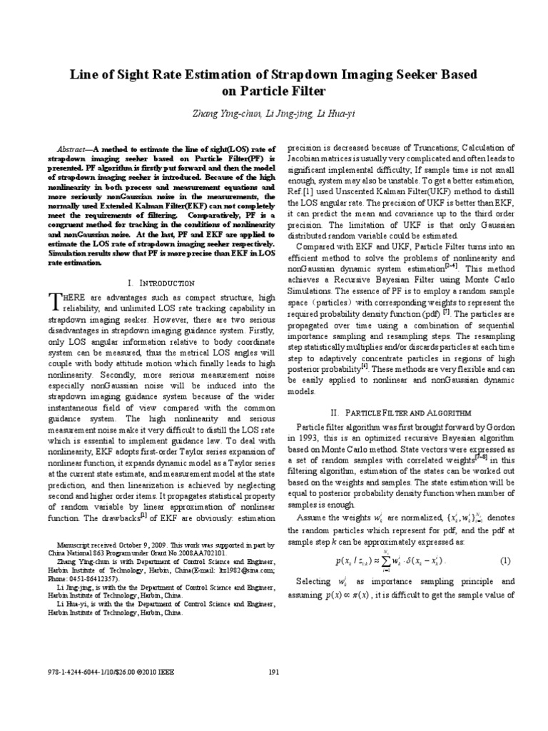 Guojiang Zhang,Yu Yao and Kemao Ma,Line of sight rate estimation of strapdown imaging guidance system based on unscented kalman filter, Proceedings of the Fourth International Conference on Machine Learning and Cybernetics, Guangzhou, pp.1574-1578,18-21 August 2005. Doucet A and Gordon N. Sequential Monte Carlo Methods in Practice. New York: Springer Verlag, 2001. Carpenter J and Clifford P. Imroved particle filter for nonlinear problems,. IEE Proc of Radar, Sonar and Navigation, 1999, 146 (1) : 227. Ho Y. [Link] Lee R. C. K, A Bayesian approach to problems in stochastic estimation and control, IEEE Trans. Automat. Contr., vol. 9, pp. 333339, Oct. 1964. Gordon N. J, Salmond D. J. and Smith A. F. M., Novel approach to nonlinear/nonGaussian Bayesian state estimation, Proc. Inst. [Link]. F, vol. 140, pp. 107113, 1993. Dan Crisan and Arnaud Doucet, A Survey of Convergence Results on Particle Filtering Methods for Practitioners, IEEE Trans. Signal Processing, vol. 50, no. 3,pp.736-746, March2002. Chen Y, Sequential importance sampling with resampling: Theory and applications, Ph.D. thesis, Stanford Univ., 2001. Bolic M, Djuric P.M..and Hong S. Resampling Algorithms and Architectures for Distributed Particle Filters. IEEE Trans. Signal Processing, vol. 53, no. 7,pp.24422450,2005. Arulampalam S, Maskell S, Gordon N. and Clapp T, A tutorial on particle filters for on-line non-linear/non-gaussian bayesian tracking. Shiqiang Hu and Zhongliang Jing Overview of particle filter algorithm, Control and [Link].20,no.4,April 2005. Crisan D, Particle filters - A theoretical perspective, in Sequential Monte Carlo Methods in Practice, A. Doucet, J. F. G. de Freitas, N. J. Gordon, Eds. Berlin: Springer Verlag, 2001. Kostantinos N.P, Dimitris H. Advanced Ssignal Processing Handbook. Boca Raton: CRC Press LLC,2001. Hu H.T and Jing Z.L,An MCMC-Based Particle Filter for Tracking Target in Glint Noise Environment, .Proceedings of the Seventh International Conference on Information Fusion. Tockholm, Sweden, 2004. International Society of Information Fusion, Fairborn, OH 45324,United States.2004:922~927. Kotecha J. H and Djuric P. M, Gaussian sum particle filtering for dynamic state space models, in Proc. ICASSP2001, pp. 34653468, 2001.