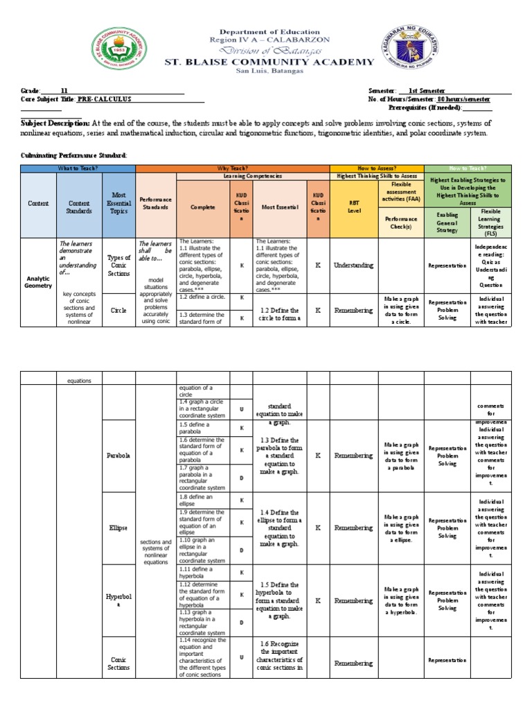 Subject Description: At the end of the course, the students must be able to apply concepts and solve problems involving conic sections, systems of