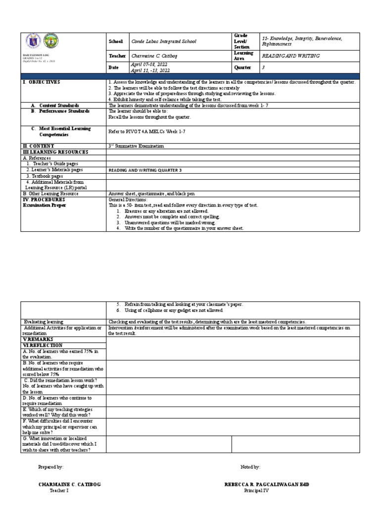 I. OBJECTIVES 1. Assess the knowledge and understanding of the learners in all the competencies/ lessons discussed throughout the quarter.