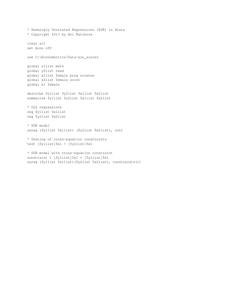 . * Seemingly Unrelated Regressions (SUR) in Stata