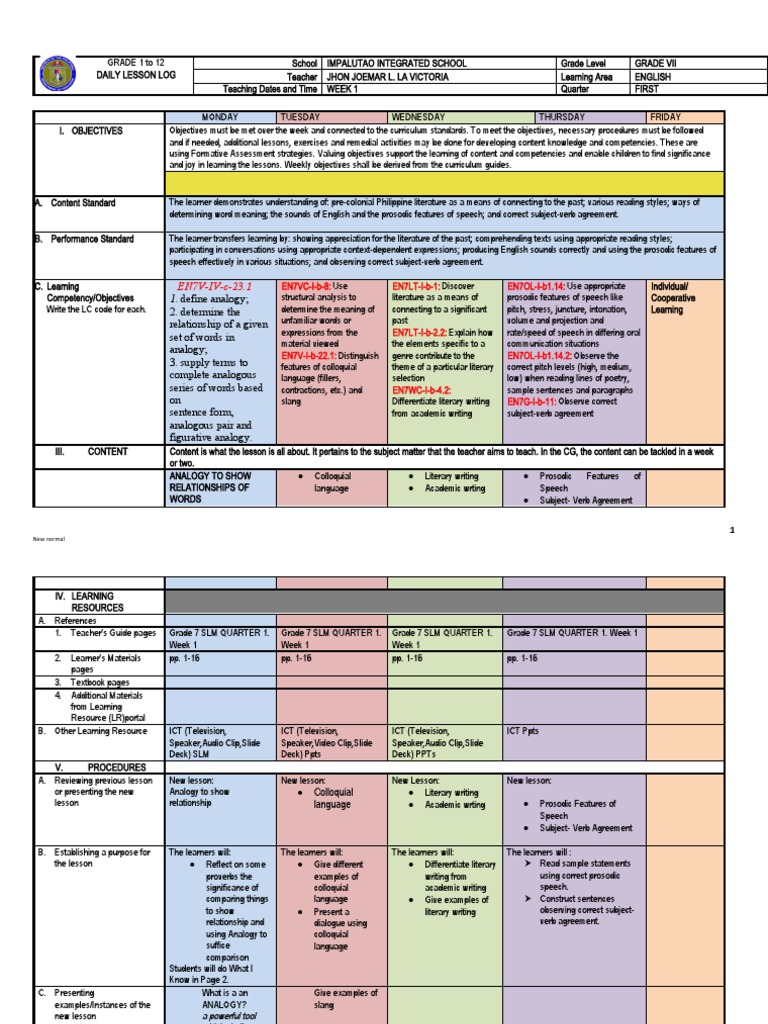 DAILY LESSON LOG Teacher JHON JOEMAR L. LA VICTORIA Learning Area ENGLISH