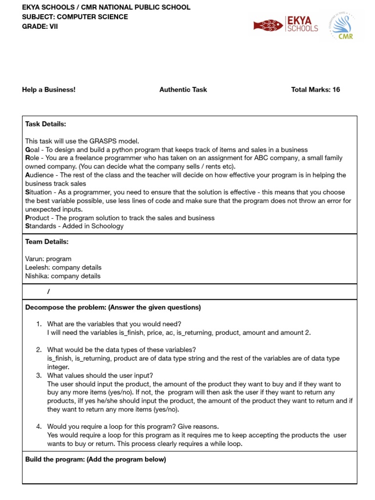 Help a Business! Authentic Task Total Marks: 16