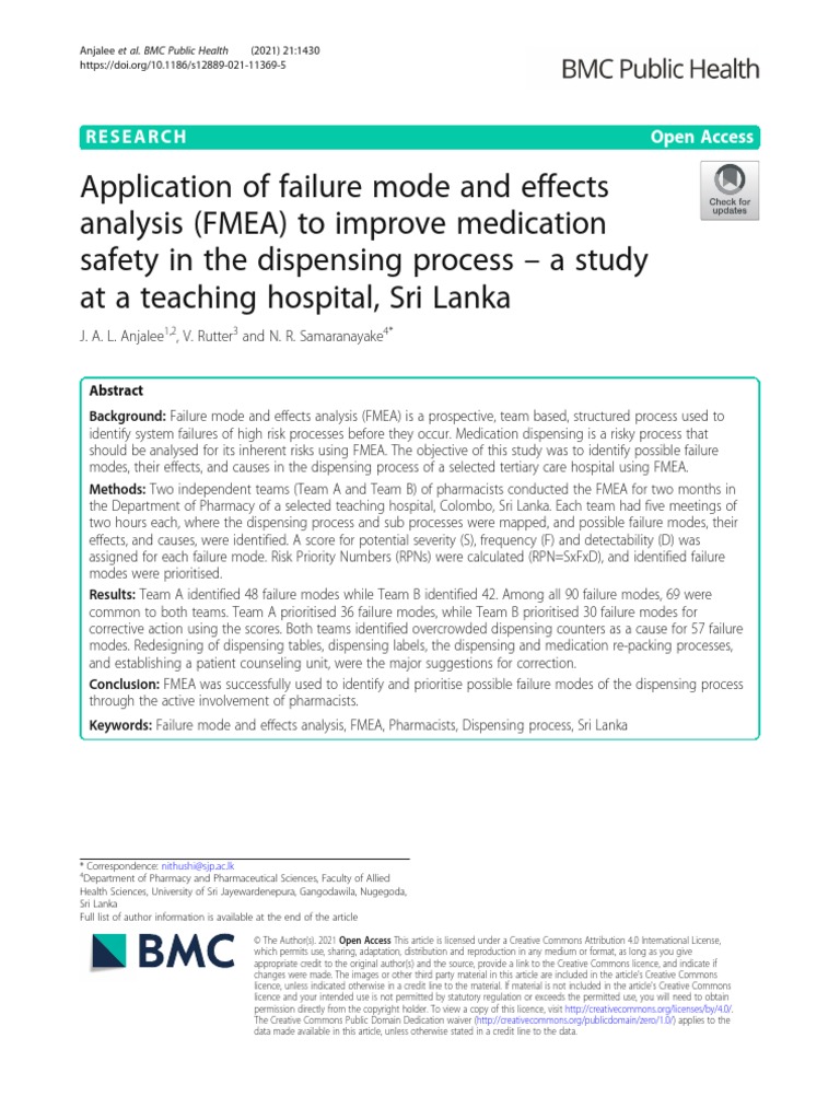 Keywords: Failure mode and effects analysis, FMEA, Pharmacists, Dispensing process, Sri Lanka