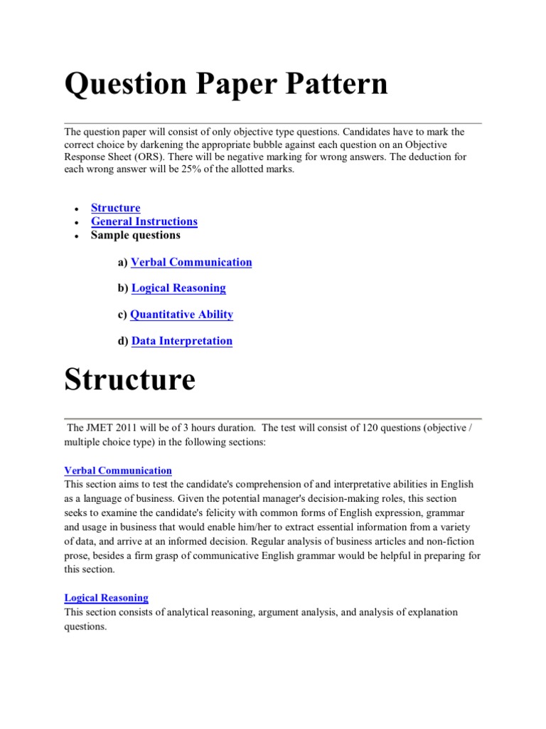 The JMET 2011 will be of 3 hours duration. The test will consist of 120 questions (objective / multiple choice type) in the following sections: Verbal Communication This section aims to test the candidate's comprehension of and interpretative abilities in English as a language of business. Given the potential manager's decision-making roles, this section seeks to examine the candidate's felicity with common forms of English expression, grammar and usage in business that would enable him/her to extract essential information from a variety of data, and arrive at an informed decision. Regular analysis of business articles and non-fiction prose, besides a firm grasp of communicative English grammar would be helpful in preparing for this section. Logical Reasoning This section consists of analytical reasoning, argument analysis, and analysis of explanation questions.