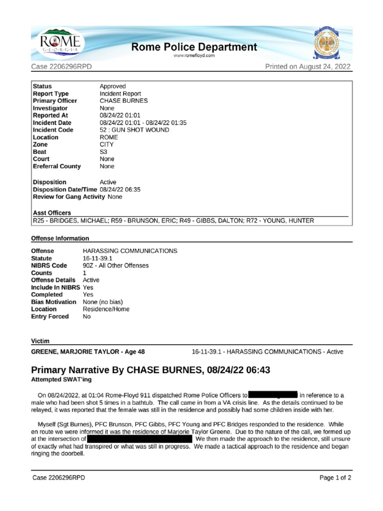 Read the police incident report that brought police to Marjorie Taylor Greene's residence.