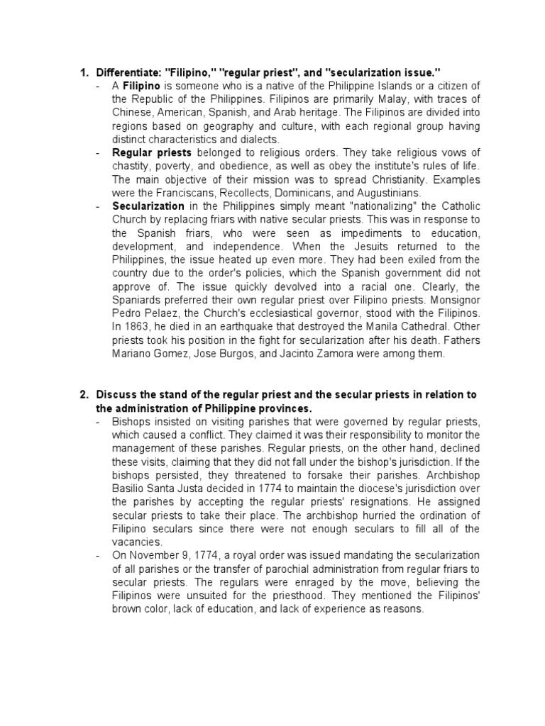 1. Differentiate: "Filipino," "regular priest", and "secularization issue.