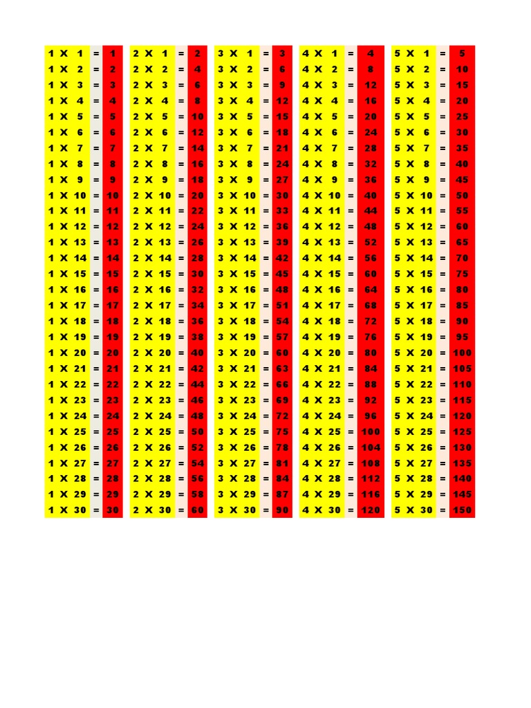 1 X 30 = 30 2 X 30 = 60 3 X 30 = 90 4 X 30 = 120 5 X 30 = 150