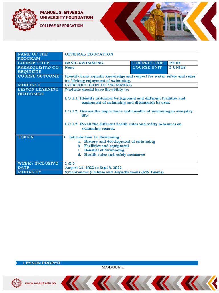 In this area, students will be introduced to the brief history of swimming, definition of