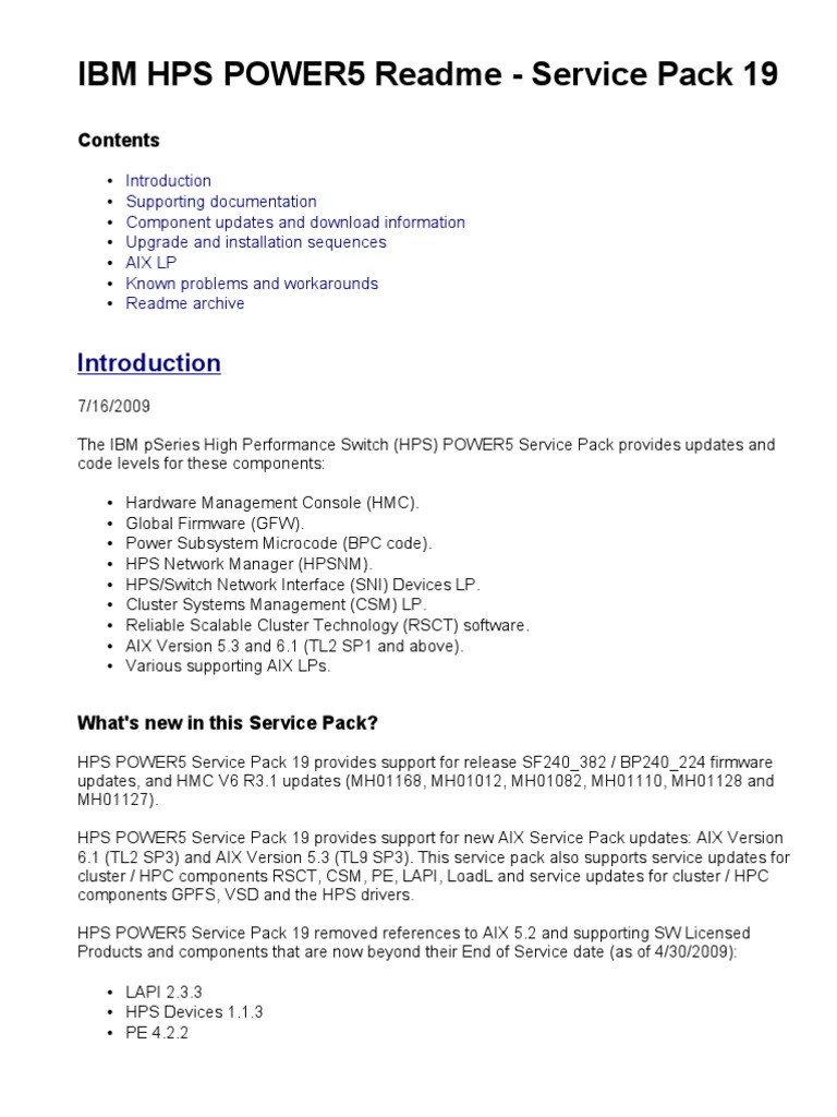 The following links are provided for archival and historical purposes only. Please refer to the latest service pack document for interactive capabilities and available software. IBM HPS POWER5 FLASH/Readme - Service Pack 19 IBM HPS POWER5 FLASH/Readme - Service Pack 18 IBM HPS POWER5 FLASH/Readme - Service Pack 17 IBM HPS POWER5 FLASH/Readme - Service Pack 16 IBM HPS POWER5 FLASH/Readme - Service Pack 15 Addendum 1 IBM HPS POWER5 FLASH/Readme - Service Pack 15 IBM HPS POWER5 FLASH/Readme - Service Pack 14 Addendum 1 IBM HPS POWER5 FLASH/Readme - Service Pack 14 IBM HPS POWER5 FLASH/Readme - Service Pack 13 IBM HPS POWER5 FLASH/Readme - Service Pack 12 IBM HPS POWER5 FLASH/Readme - Service Pack 11 IBM HPS POWER5 FLASH/Readme - Service Pack 10 IBM HPS POWER5 FLASH/Readme - Service Pack 9 IBM HPS POWER5 FLASH/Readme - Service Pack 8 IBM HPS POWER5 FLASH/Readme - Service Pack 7 IBM HPS POWER5 FLASH/Readme - Service Pack 6 IBM HPS POWER5 FLASH/Readme - Service Pack 5 IBM HPS POWER5 FLASH/Readme - Service Pack 4 (see SP5) IBM HPS POWER5 FLASH/Readme - Service Pack 3 IBM HPS POWER5 FLASH/Readme - Service Pack 2 IBM HPS POWER5 FLASH/Readme - Service Pack 1