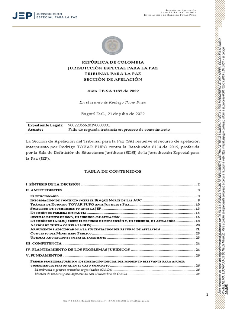 Este documento resume el Auto TP-SA 1187 de 2022 de la Sección de Apelación del Tribunal para la Paz. Resuelve el recurso de apelación interpuesto por Rodrigo Tovar Pupo contra una decisión …