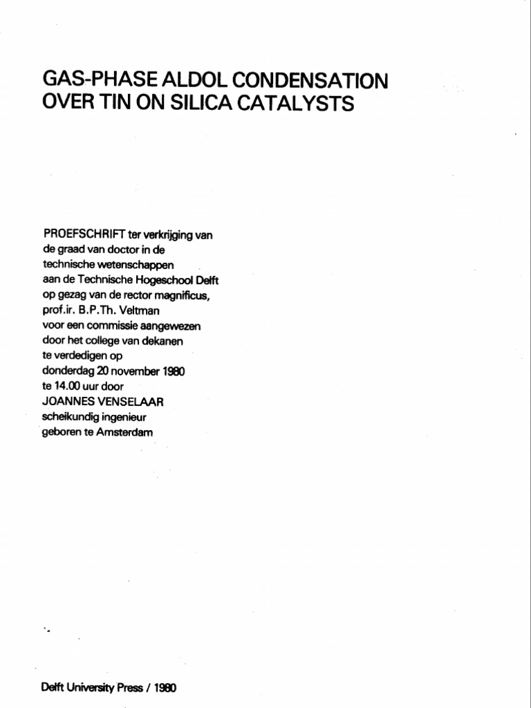 condensation over this catalyst more fully, especially of ethanal. Aspects covered here are catalyst preparation and performance, the mechanistic background of the catalytic activity and the kinetics of the reaction. Chapter 1. contains a literature survey on catalytic aldol condensation, with special attention to the work of Swift et al quoted above. Catalyst preparation and characterization are discussed in chapter 2. Several methods of preparing