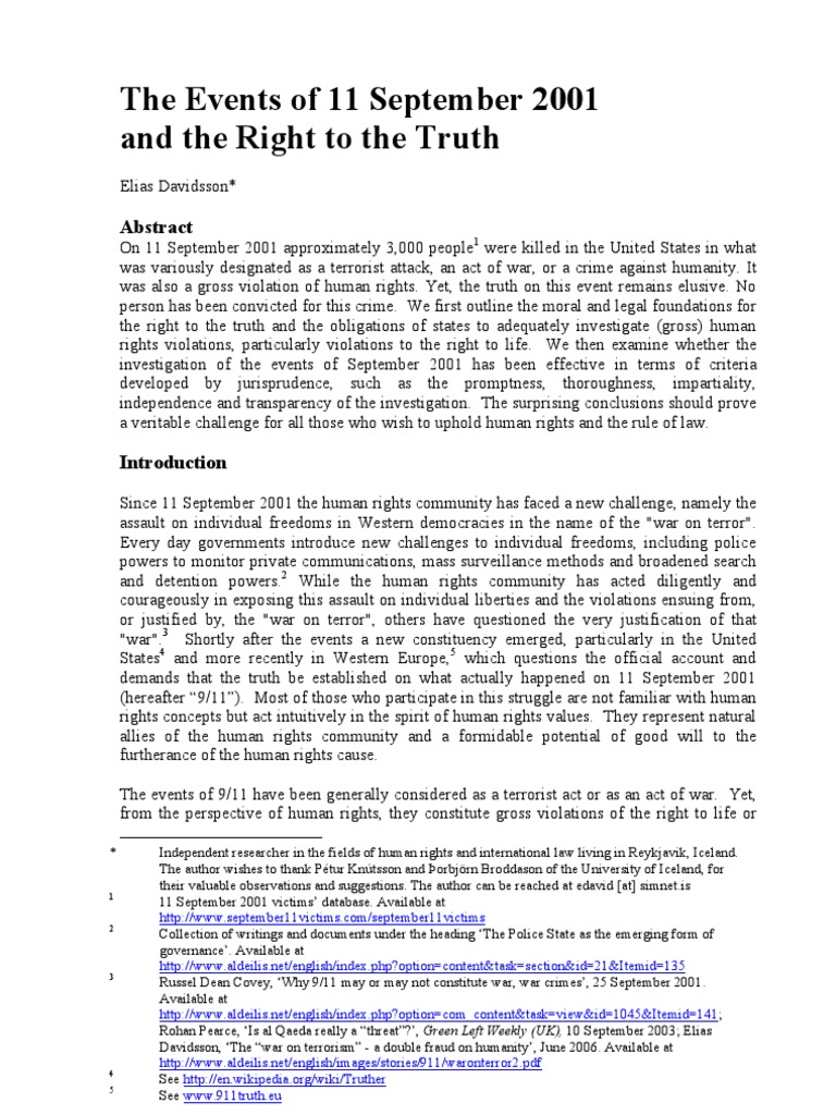 The document discusses the right to truth regarding human rights violations like the events of September 11, 2001. It outlines how the right to truth is founded in principles of democracy and accountability, and how international courts and UN bodies have recognized an inalienable right to know the truth about past crimes. The document examines whether the official investigation into the events of 9/11 met international standards of being prompt, thorough, impartial, independent and transparent. It argues that establishing the full truth is important to prevent future violations and provide a remedy to victims and their families.